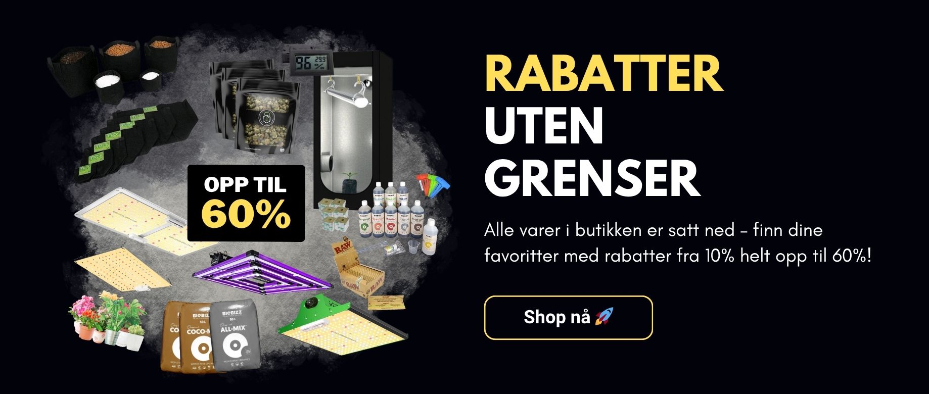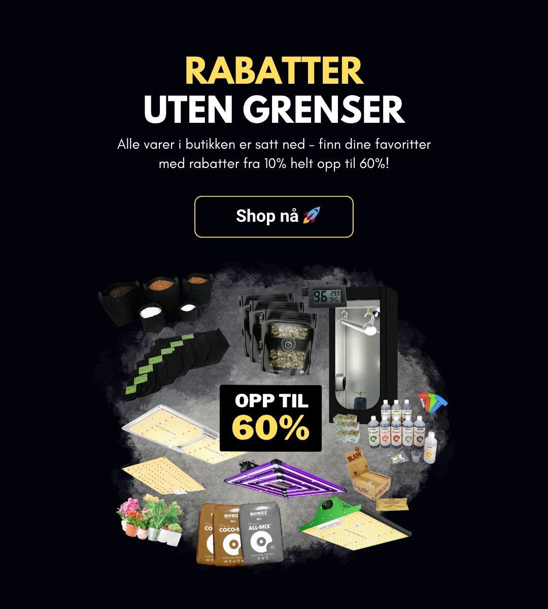 Vi er Nordens største growshop og har et bredt utvalg av dyrkeutstyr, slik at du kan finne alt du trenger for å dyrke planter hjemme. Her finner du alt fra belysning til gjødsel og dyrkeutstyr. Hvis du ønsker å dyrke planter hjemme, eller allerede er i gang, men mangler utstyr, har du kommet til helt riktig side.