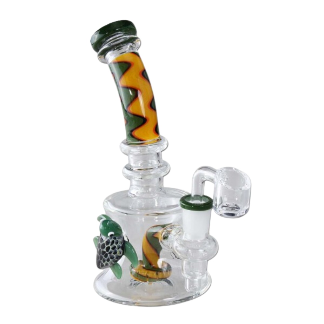 Elegant dabrig fra Black Leaf®. Hvor søtt er det? Duften av deilige dabs har tiltrukket en søt skilpadde, som nå løper opp i det lille yndige oljerøret. Det gulgrønne spiraldesignet av trekkpipen og perkolatoren fullfører det vakre utseendet. Men den lille perlen er også en svært funksjonell og effektiv bong for voks og andre ekstrakter.
