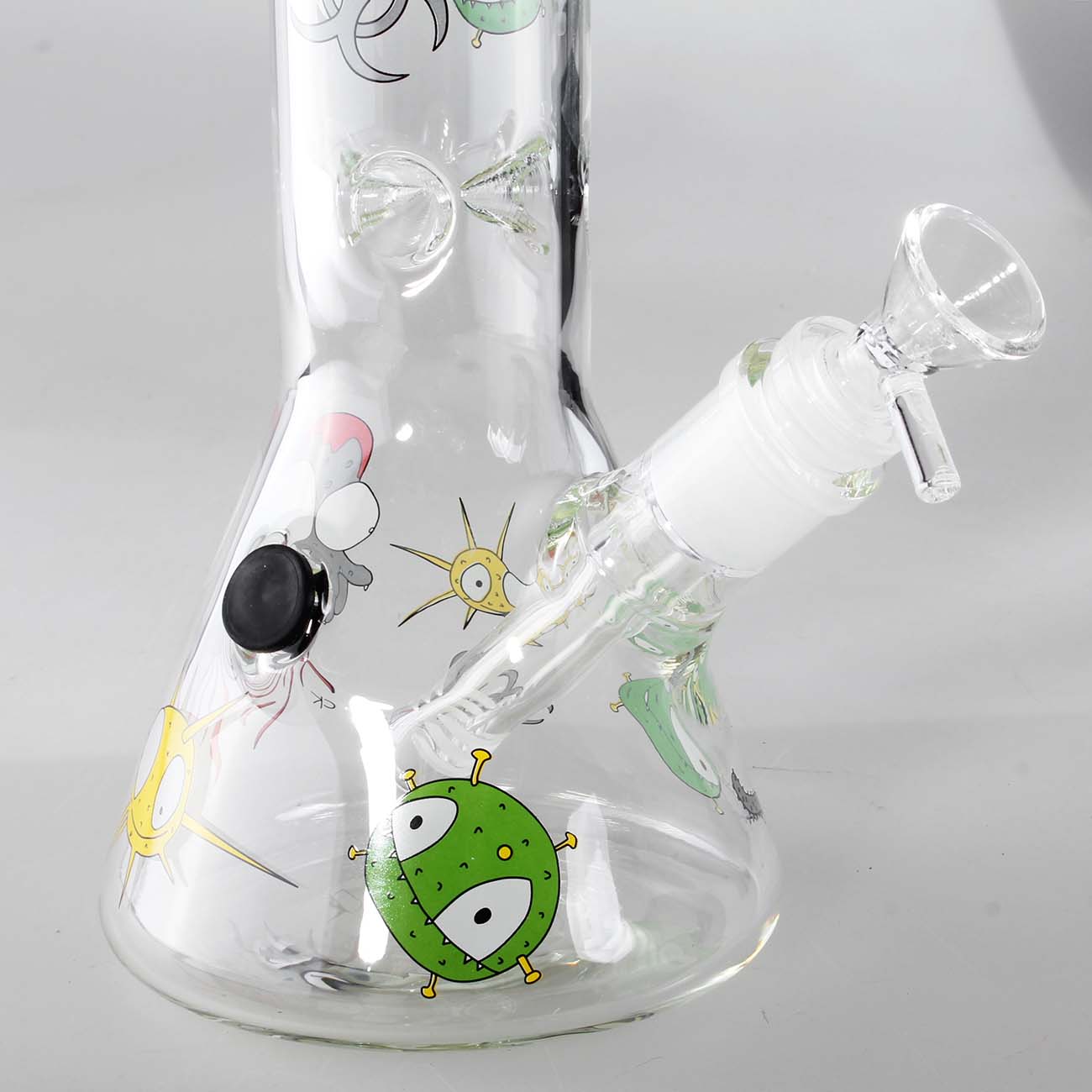 Angrepet fra de søte og finurlige Haze Invaders kan bare lykkes i å gjøre deg lykkelig høy! Downstem med mange hull sikrer masse vannvirvler og luftvirvler og dermed behagelig røykavkjøling og røykfiltrering. Glasshodet er for urter, sklisporhullet for avfyring er utstyrt med en propp, og det er også et iskammer for iskaldt skudd. Den kjølige isbongen er veldig robust med en veggtykkelse på 5 mm, mens inhalering med det behagelig avrundede munnstykket er veldig behagelig å ta på.