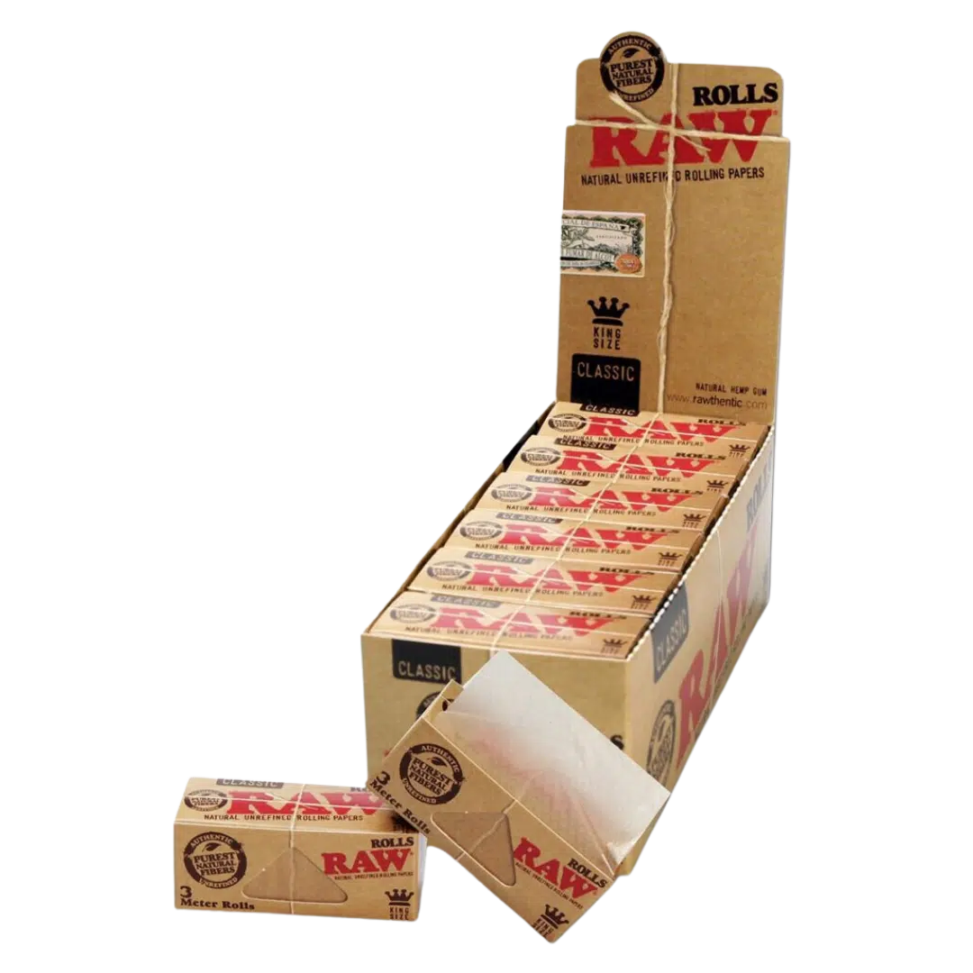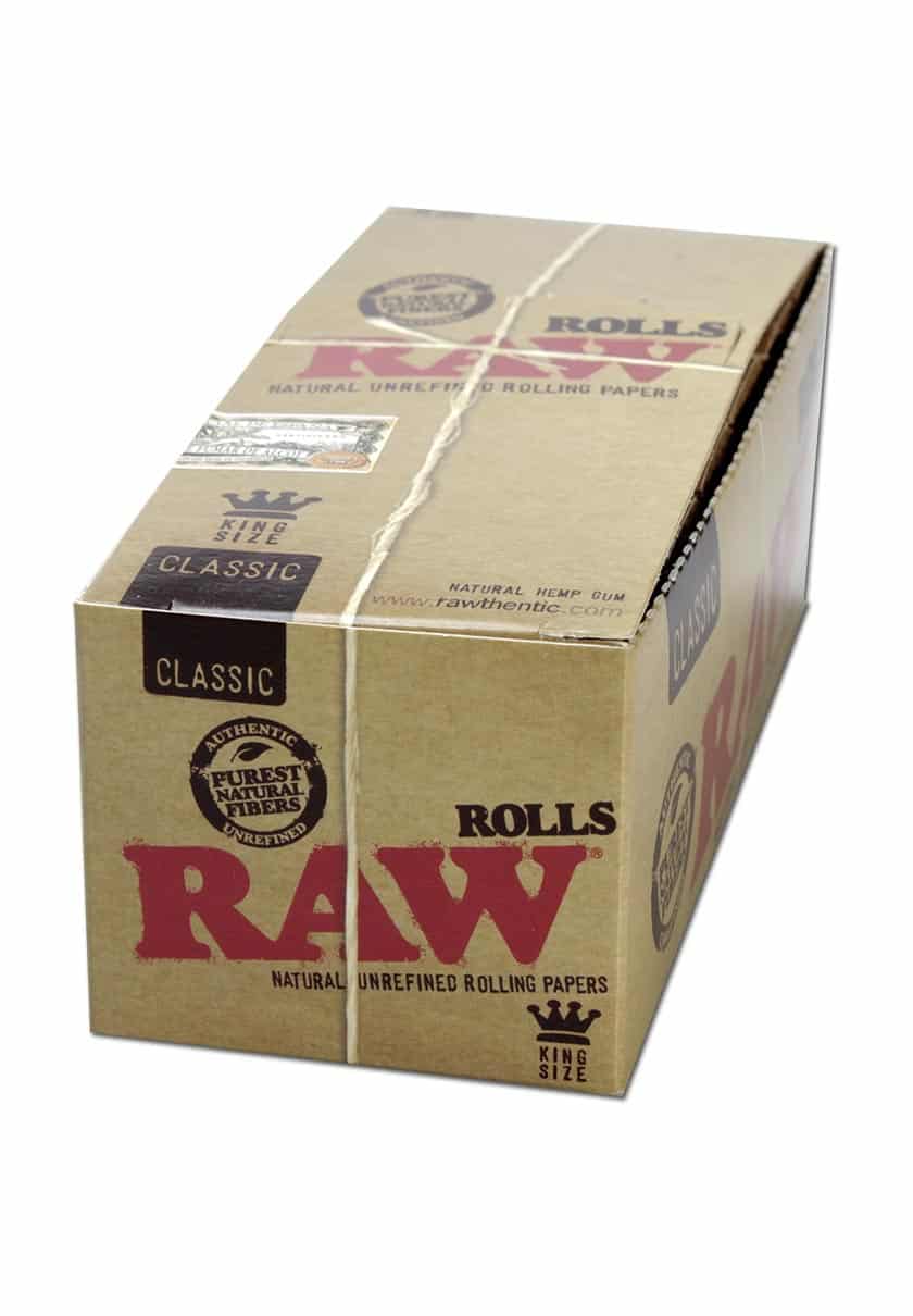 RAW-ruller – sigarettpapir i én lang remse – laget av rå, organiske og ublekede naturfibre. De tre meter lange rullene leveres med 12 stk i en displayboks.