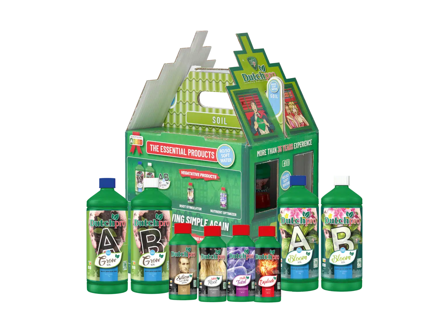 Planter med stort utbytte trenger et stort og sunt rotsystem, og derfor har Dutch Pro inkludert sine fremragende tilsetningsstoffer Take Root og Multi Total. Take Root oppfordrer aktivt plantene til å bygge opp en tykk og sunn rotmasse, mens Multi Total forbedrer jordstrukturen og øker næringsopptaket. For å fullføre sortimentet har Dutch Pro inkludert en flaske av deres berømte Explode! Dutch Pro Explode er muligens den beste blomstringsboosteren som finnes, og sikrer en eksplosiv blomstringsperiode!